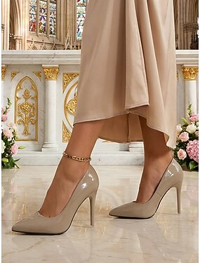 Женские туфли-лодочки на шпильке из лакированной кожи телесного цвета – элегантные туфли для матери невесты на венчание в церкви.