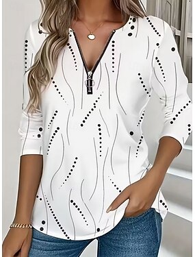 Жен. Футболка Молния С принтом Графика Геометрический принт Винтаж Мода Стиль Длинный рукав Вырез под горло V-образный вырез Обычные топы Повседневные Синий Белый Желтый Розовый Красный