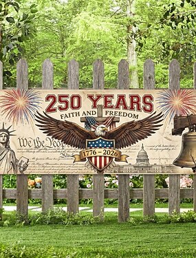 Памятный баннер к 250-летию США с изображением орла, Колокола Свободы и достопримечательностей, прославляющих веру и свободу (1776-2026), в красно-синих цветах.
