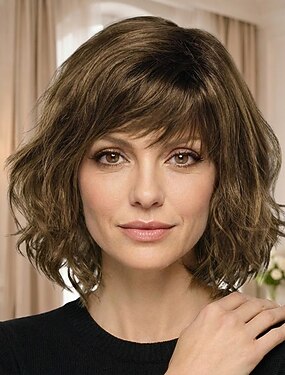Натуральный волнистый боб-парик из синтетических волос для женщин - темно-коричневый с мягкими волнами и челкой, зачесанной набок.