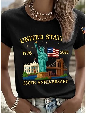 День независимости Америки Женская футболка Патриотическая С принтом Флаг Стильная Классическая Повседневная Короткий рукав Круглый вырез Обычные топы Ежедневная Синяя Черная Красная Зеленая Лето