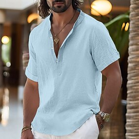 Муж. Рубашка Льняная рубашка Рубашка с воротником-стойкой Поповер Рубашка Летняя рубашка Одежда для пляжа Полотняное плетение Отпуск Повседневные Черный Белый Желтый Розовый С короткими рукавами Хенли