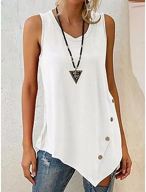 Топ из хлопка и льна для женщин Майка на бретельках С кнопками Однотонного цвета Повседневная Стильная Базовая Без рукавов Круглый вырез Длинные топы На каждый день Черный Белый Вино Серый Лето Весна
