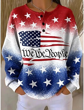 День независимости Американский юбилей Патриотическая женская толстовка с графикой Буквы Модная Повседневная печать Длинный рукав Круглый вырез Повседневный Улица Кнопки Синий Черный Красный