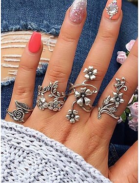 Женские кольца в богемном стиле, набор из 4 штук, цветочный дизайн, регулируемая посадка, идеально подходят для пляжного отдыха, летних прогулок и повседневной носки.