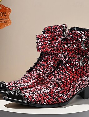 Мужские красные ботинки в стиле панк из натуральной кожи с геометрическим узором и двойными пряжками, ботинки в стиле вестерн из 100% коровьей кожи для сцены и ночных клубов