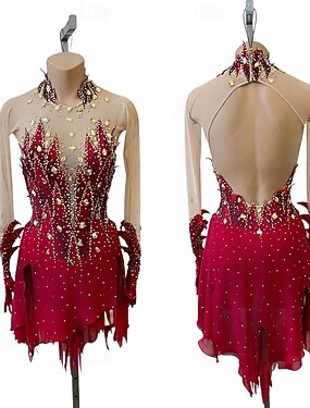 Платье для фигурного катания Жен. Катание на коньках Платья Красный Пэчворк Открытая спина Эластичная Учебный Соревнование Одежда для фигурного катания Классика Стразы Длинный рукав