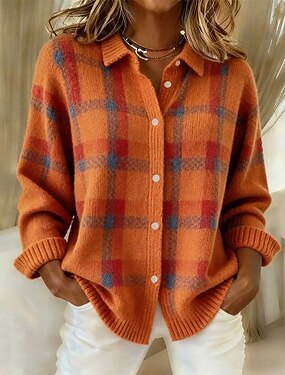 Жен. Вязаная ткань Кардиган Элегантный стиль Мода Уличный стиль Сплошной цвет В клетку Рубашечный воротник Пэчворк Пуговицы Трикотаж Длинный рукав Обычные топы Вязать