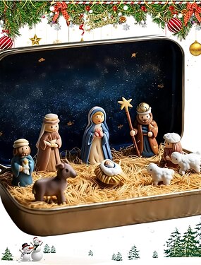 Миниатюрный рождественский набор, рождественский вертеп ручной работы в жестяной коробке, переносная карманная статуэтка Святого семейства Вифлеема, небольшое религиозное украшение для стола, полки