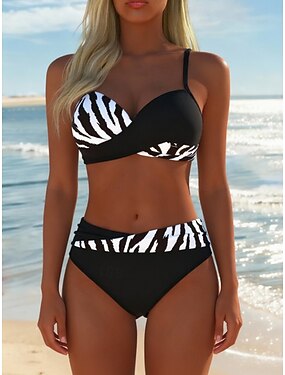 Жен. Купальники Бикини 2 шт. Смелые купальник Тонкие Открытая спина Отпуск Одежда для пляжа Принт "Зебра" V-образный вырез Без рукавов Купальники