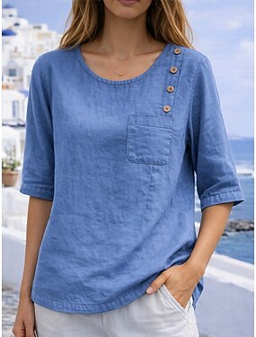 Жен. Блуза Рубашка из искусственного льна Карман Пуговицы Полотняное плетение Классический На каждый день Рукав до локтя Вырез под горло Обычные топы Повседневные Синий Красный Зеленый Серый
