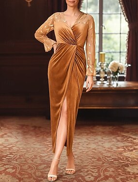 Платье в форме колонны длины пола формальное платье вечернее платье платье для матери невесты длинный рукав V-образный вырез элегантное винтажное платье для вечеринки спандекс с пайетками и разрезом