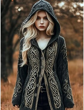 Жен. Кардиган Повседневные На каждый день Графика Геометрический принт Рельефный узор Капюшон Пэчворк Карман Пуговицы Длинный рукав Длинные топы Вязать на открытом воздухе выходные Черный Осень Зима