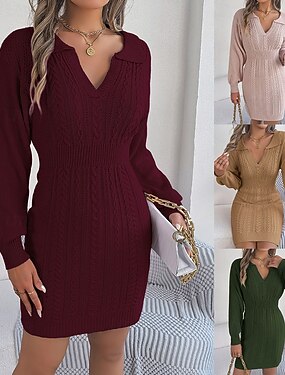Жен. Мини-платье Платье-свитер Элегантный стиль Мода Современное Офис Повседневные Праздники Стандартный Полотняное плетение Длинный рукав V-образный вырез Винный Военно-зеленный Хаки Весна Осень Зима