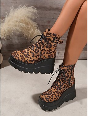 Женские ботинки на массивной платформе со шнуровкой — леопардовый принт, отделка из искусственного меха черного и бордового цветов, застежка-молния, стильные повседневные зимние кроссовки