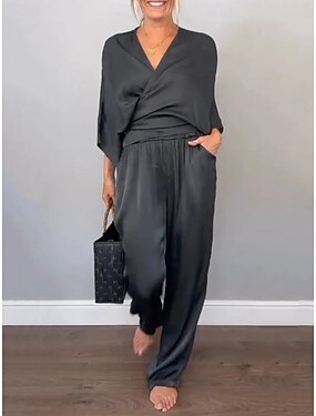 Жен. Блуза Комплекты брюк Длинный рукав V-образный вырез Сплошной цвет Активный Уличный стиль Отпуск На каждый день Черный Военно-зеленный Пыльно-синий Осень Стандартный