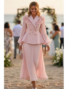 Из двух частей А-силуэт До щиколотки Свадебное платье для гостей свадебные платья для гостей Элегантный стиль Винтаж Повседневные Длинный рукав Лацкан Вечеринка в саду Свадьба с 3D Цветы Плиссировка