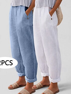 Комплект из 2 женских повседневных брюк из 100% хлопка, длина до щиколотки, средняя посадка, простые боковые карманы, эластичный пояс, воздухопроницаемость, комфорт, неэластичные, для повседневной