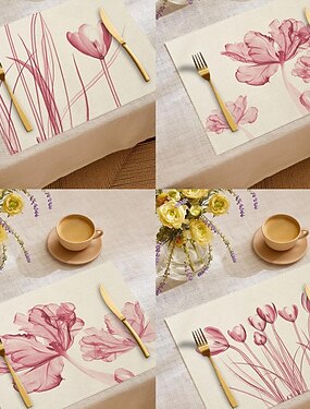 Салфетка под тарелку из ткани с рисунком тюльпанов розового цвета, прямоугольная, 100% полиэстер, абстрактный рисунок зеленых растений, машинная стирка, термостойкий декор для обеденного стола,