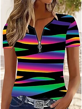 Жен. Футболка Молния Цветовые блоки Четверть молния Графика Геометрический принт тропический Гавайский Стиль С короткими рукавами Вырез под горло Обычные топы Повседневные Спорт На выход Пурпурный