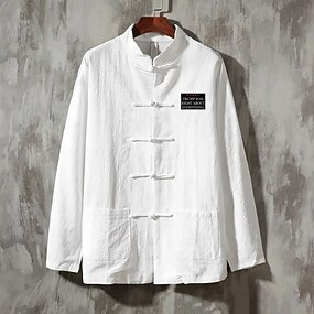 Муж. льняная рубашка Повседневная рубашка Кнопка рубашка Полотняное плетение Отпуск Для улицы Черный Белый Темно-синий Бежевый Длинный рукав дедушкин воротник Весна лето Одежда Карман