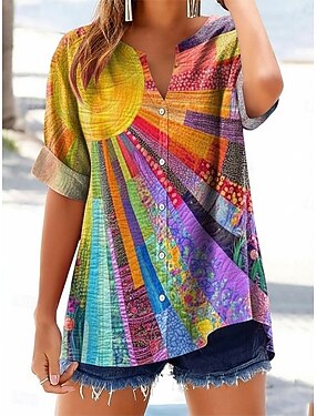 Жен. Рубашка Пуговицы С принтом Графика Загар и защита от солнца Отпуск Повседневные Стиль С короткими рукавами V-образный вырез Обычные топы Повседневные Праздники На выход Цвет радуги Лето Весна