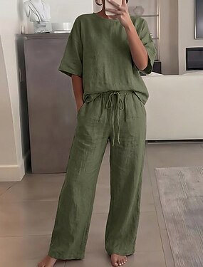 15% льна, женские брюки, комплекты из льна, базовые, однотонные, с карманами, эластичным поясом, футболка, брюки, повседневные, уличный стиль, длинный рукав, круглый вырез, синий, черный, белый, темно-синий, светло-коричневый, летние, весенние