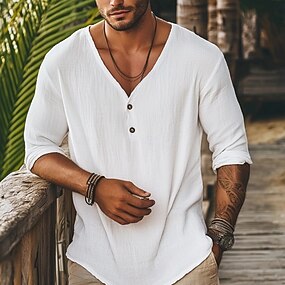 Муж. Футболка Рубашка с длинным рукавом Футболка из льняной ткани Длинный рукав V-образный вырез Лето Все сезоны Сплошной цвет Полотняное плетение Повседневные На каждый день Уличный стиль