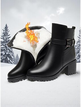 Женские черные кожаные ботильоны - теплые зимние ботинки на меховой подкладке, на среднем каблуке, с боковой молнией и пряжкой для холодной погоды, работы &верхняя одежда