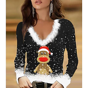 Рождественская Женская Футболка Праздничная Длинный Рукав V-образный Вырез Пухлый Воротник Праздничная Неофициальная Зимний Топ Черный Принт