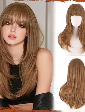 Длинный прямой многослойный парик рыжевато-русого цвета с челкой, 24 дюйма, из синтетических натуральных волос, мягкий, термостойкий, длинный парик для женщин, для повседневного использования и