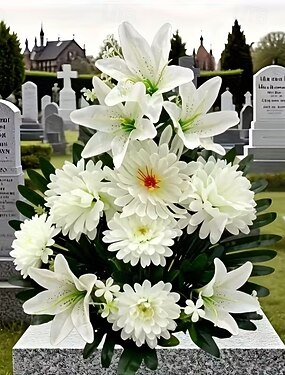 Искусственные цветы для кладбища на День памяти, украшенные очень крупными зелеными листьями арековой пальмы и белыми лилиями, устойчивы к ультрафиолетовому излучению, подходят для использования на