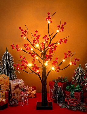 Декоративная гирлянда в виде дерева с имитацией красных фруктов, 53 см/20,87 дюйма, 24 светодиода, для весеннего фестиваля и Нового года, для использования в спальне, гостиной, столовой, на праздники,