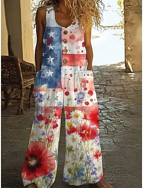 День независимости Патриотические комбинезоны с цветочным принтом для женщин без рукавов широкие брюки квадратный вырез карманы пуговицы повседневные пляж свободные красные фиолетовые оранжевые летние