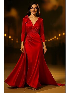 Русалка Футляр В пол Выпускные платья Вечернее платье С пышной юбкой Торжественное платье Элегантный стиль Винтаж Рукав 3/4 V-образный вырез Свадьба Официальные Сатин Стретч-сатин V Назад с Оборки