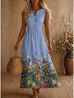 Жен. Платье средней длины Платье в стиле бохо Винтажное платье Повседневное платье Винтаж Текучий Дом Для улицы Праздники Стандартный Богемный Цветочный принт Без рукавов V-образный вырез