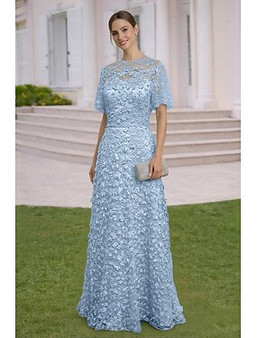 А-силуэт Платья В пол Свадебное платье для гостей Вечернее платье Платье для матери невесты С короткими рукавами Вырез под горло Элегантный стиль Простой Украшенный Официальные Кружева с 3D Цветы