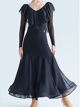 Женское платье для бальных танцев, с длинным рукавом, сетчатое, для вальса, танго, латины, соревнований, выступлений, тренировок, с оборками по подолу, элегантная струящаяся юбка – черное