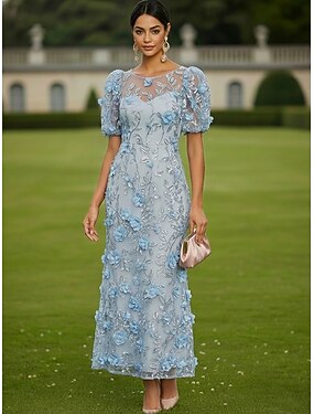 Футляр До щиколотки Кружевное платье коктейльные платья Элегантный стиль Винтаж С цветами С короткими рукавами На одно плечо Вечеринка в саду Свадьба Сатин Тюль с 3D Цветы Бант(ы)