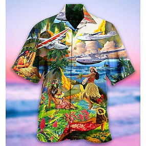 Муж. Самолет хула девушки Рубашка Гавайская рубашка Рубашка Алоха С короткими рукавами Рубашка Отложной тропический Мода Гавайский Повседневные Пляж Гавайский Синий S M L