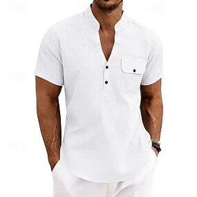 Муж. Рубашка Льняная рубашка Летняя рубашка Одежда для пляжа Рубашка Хенли Сплошной цвет Повседневные Отпуск Синий Черный Белый Темно синий С короткими рукавами V-образный вырез Лето Весна Одежда