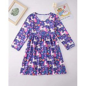 Девушки ' 3D Графика единорогом Платье Длинный рукав Лето Весна Отпуск Повседневные Праздники Красивый Милая Дети 4-12 лет Повседневное платье Платье A-силуэта До колена Стандартный