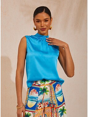 атласный топ без рукавов с воротником-стойкой и широкими плечами для отдыха