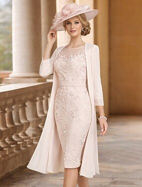 Из двух частей Футляр До колена Свадебное платье для гостей Платье для матери невесты Рукав 3/4 Шейная лодка Элегантный стиль Винтаж Большие размеры Свадебный гость Церковь Шифон Кружева Платья-жакеты