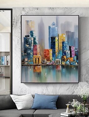 Композиция из 3D-городского пейзажа, выполненная вручную, с яркими цветами и детальной работой кисти, демонстрирующая отражения в воде небоскребов, созданная с помощью техники многослойной текстуры