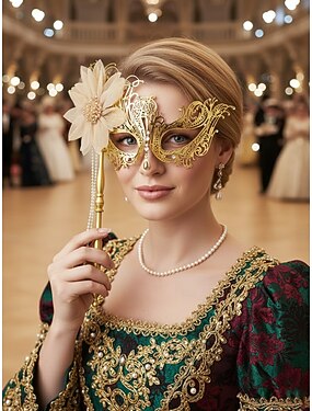 Женская золотая филигранная маска на руку для маскарада на Марди Гра с цветочными элементами — элегантный венецианский костюмный аксессуар для вечеринок и балов