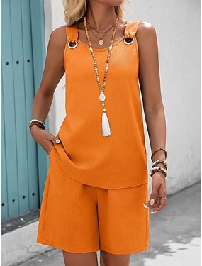 Жен. Комплекты шорт Без рукавов Вырез под горло Сплошной цвет Мода Уличный стиль Повседневные на открытом воздухе Оранжевый Лето Стандартный