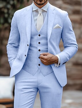 Мужской Смокинги Льняные костюмы Свадьба на пляже Весенняя свадьба Синий Белый Весна лето Костюм Лацкан с тупым углом Мода Деловые Однотонный Приталенный крой Набор из 3 предметов Однобортный с 2