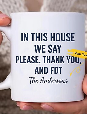 Персонализированная забавная подарочная кружка с текстом вашего имени в этом доме, мы говорим "пожалуйста", рождественский подарок для друзей, семьи, коллег, забавная керамическая кофейная чашка 11