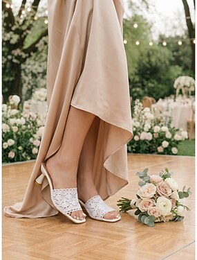 Элегантные белые кружевные мюли для женщин — романтичные босоножки на каблуке с цветочным кружевом и стильным каблуком-катушкой для свадеб в саду, девичников и летних вечеринок на открытом воздухе.